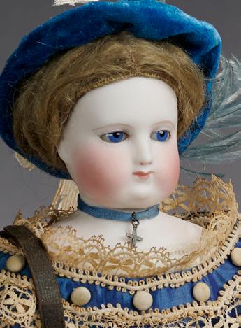 Comments: French, Barrois, circa 1860. Value Points: beautiful early poupée in desirable petite size, brilliant eyes, rare bisque arms, wearing splendid costume of ice blue silk twopiece gown with hand-made lace trim, undergarments including wired hoop skirt, stockings with rare blue garters having ormolu clasps, leather heeled boots, leather purse, and blue velvet and woven bonnet. Ex-Ursula Brecht Collection. $4000/5000