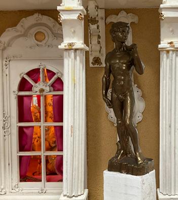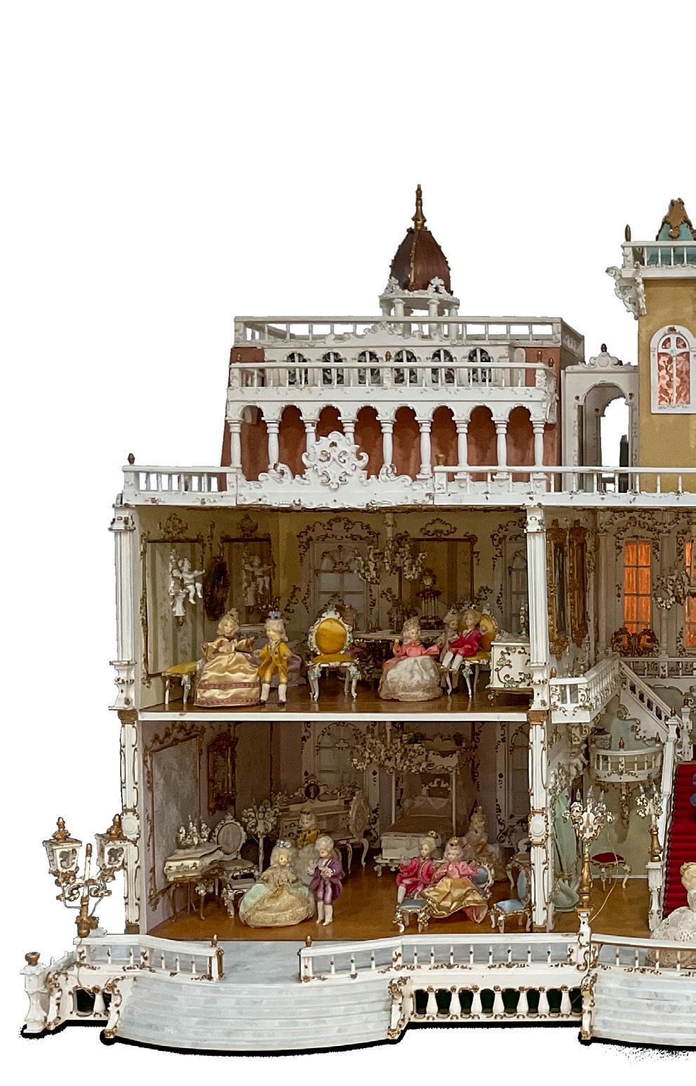 17” (43 cm.) x 17” base, 18”h. Arranged upon a wooden platform is a festive blue painted carousel which is lavishly decorated with painted panels and a roof top upon which are posed six cherubs with violins; six chairs, designed to spin merrily around, are suspended, each with doll, and there are three sets of wooden stairs leading to the ride, and a separate ticket booth with ticket master. The carousel has been electrified to allow movement and lights which needs to be remastered. Excellent condition. Germany, Spielwaren from the workshops of Rudolf Szalasi, 1950s. $1100/1500