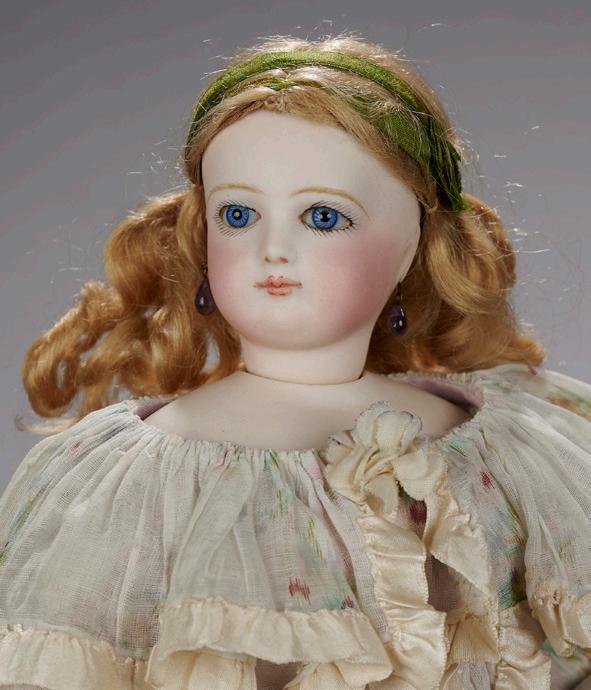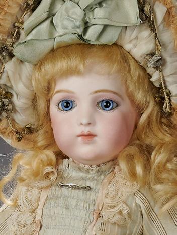 13” (33 cm.) Bisque swivel head on kidedged bisque shoulderplate, blue glass paperweight inset eyes with dark iris rims, dark eyeliner, painted lashes, feathered brows, accented nostrils, closed mouth with shaded lips, upturned lip corners as though smiling, pierced ears, blonde mohair wig over cork pate with elaborately-arranged original coiffure, kid poupée body with square-cut collarette and bisque hands. Condition: generally excellent.