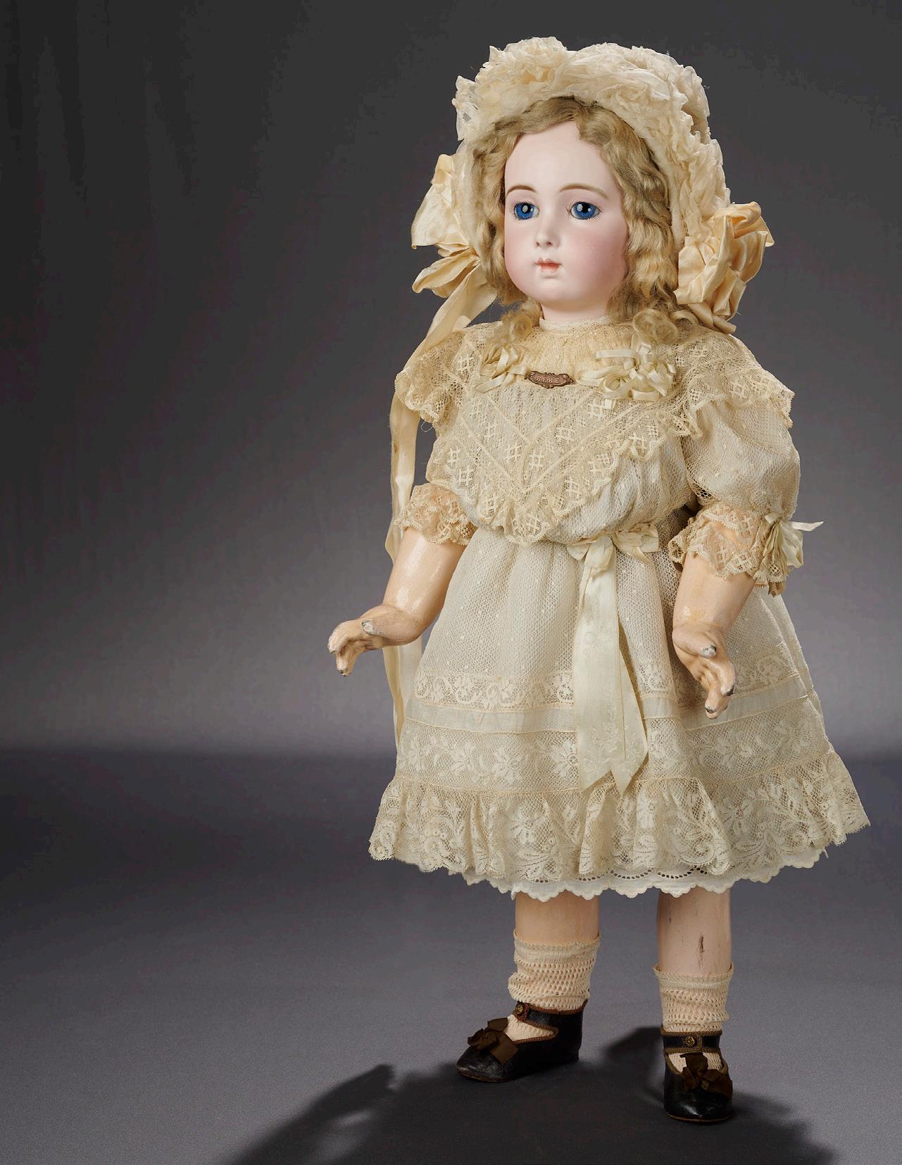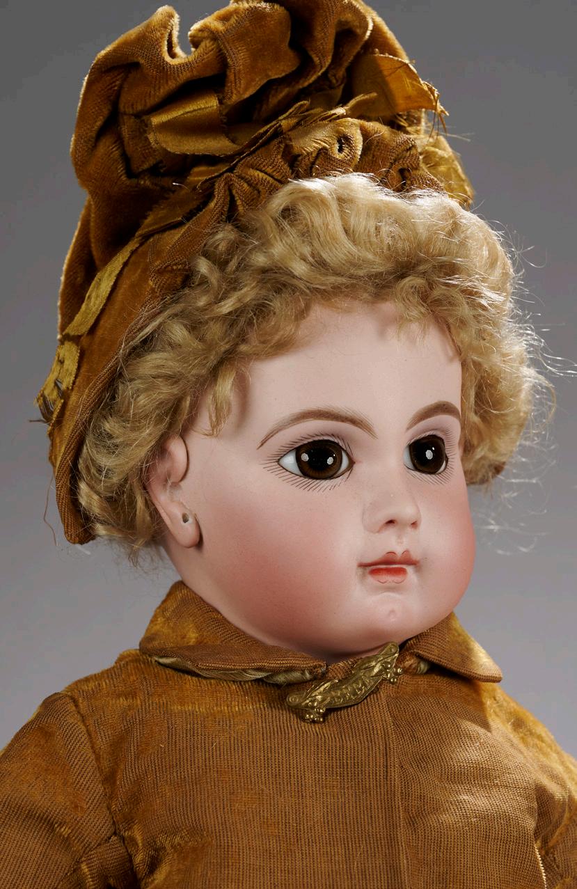 18” (46 cm.) Pressed bisque socket head with delicate pale complexion contrasting very plump cheeks and chin, almond-shaped brown glass paperweight eyes, dark eyeliner, mauve eye shadow, painted lashes, feathered brows, accented eye corners, shaded nostrils, closed mouth with defined space between the shaded and accented lips, pierced ears, original handstitched blonde mohair wig over cork pate, all-wooden fully-articulated body with dowel and pin jointing at shoulders, elbows, wrists, hips, knees and ankles, nicely costumed. Condition: generally excellent. Marks: 5 (head) N3C-34 (impressed symbols on back torso). Comments: Leon Casimir Bru, his earliest version of his Bébé Modele, 1879. Value Points: extremely rare bébé with exceptional quality of bisque, sculpting and painting, splendid eyes, early signed wooden fully-articulated body with maker’s mark. $22,000/27,000
