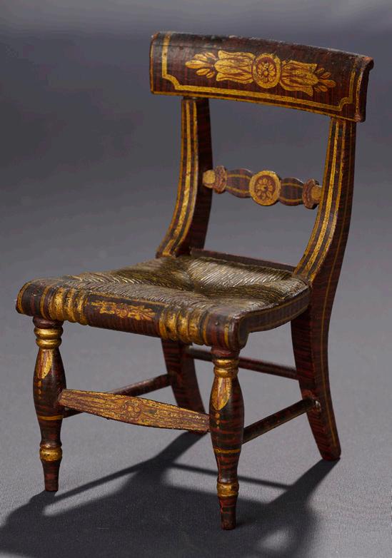8” (20 cm.) Metalframed rocking chair with gilt finish has beveled oval mirror serving as back rest, and velvet seat with fringed detail, French. Along with early brown velvet cat with handpainted details and black bead eyes, German, circa 1900. Excellent condition. $400/500