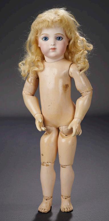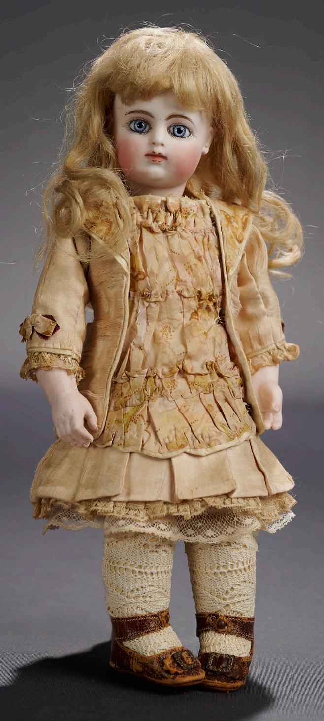 13” (33 cm.) Pale bisque shoulder head with very plump face, cobalt blue glass inset eyes, dark eyeliner, very daintily-painted lashes and brows, accented nostrils, closed mouth with center accent line, unpierced ears, blonde mohair wig with braided coiffure, shapely kid poupée body with tiny waist, well-rounded derriere, gusset-jointing at hips and knees, kid-over-wooden upper arms, bisque arms to above the elbows, well-sculpted bisque hands with defined knuckles and
