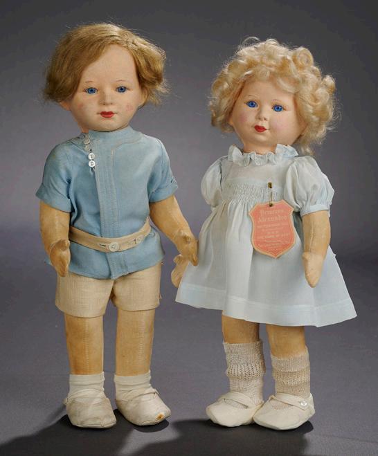 features, blue glass eyes, painted lashes, feathered brows, accented nostrils, closed mouth with gentle smile, brunette or blonde mohair short curly wig, muslin torso, jointed velvet arms and legs. Condition: generally excellent, he has few smudge marks on face. Marks: The Genuine Princess Alexandra British made doll Chad Valley (paper label). Comments: Chad Valley, circa 1935, portrait dolls of the Princess Alexandra and Prince Edward, Duke of Kent. Value Points: the dolls, which are very rare models from the Chad Valley royal series, are wearing their factory original costumes. $700/900