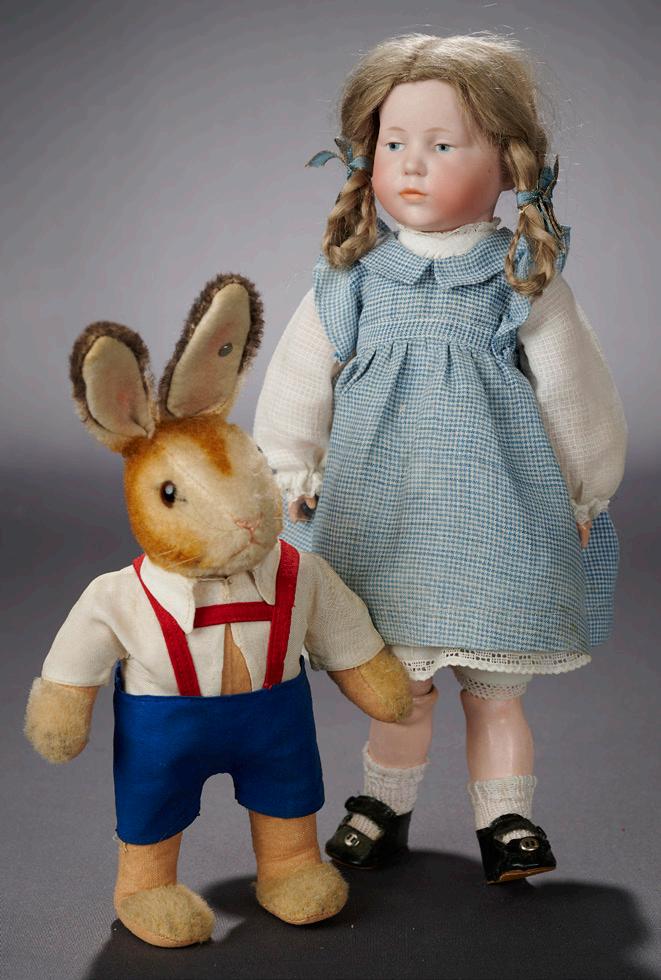 13 ½” (34 cm.) Bisque socket head, brown glass sleep eyes, dark eyeliner, painted lashes, short feathered brows, accented nostrils, closed mouth with decorative glaze on lips, blonde mohair wig, composition and wooden ball-jointed body, antique costume. Condition: generally excellent. Marks: K*R Simon & Halbig 117/A 34. Comments: Kammer and Reinhardt, circa 1912, the model known as “Mein Liebling” (my darling). Value Points: petite size of the beloved doll has choice bisque, original body and body finish. $1800/2300