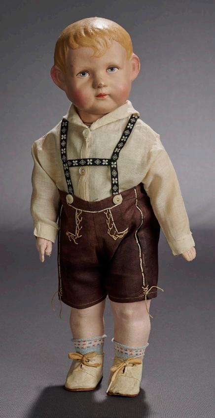 5 ½” (14 cm.) Each is a very firmly stuffed all leather baby with pressed facial features on swivel head, impasto painted blonde hair, oil painted complexion and facial features, outlined blue eyes, “O” shaped mouth, bent limb body with jointing at shoulders and hips. Condition: generally excellent. Comments: French, circa 1915, the studio maker of the dolls, of which very few are known to exist, remains unknown although some clues indicate their origin as examples of the dolls of the Russian/ Paris emigre movement of post WWI. Value Points: rare little dolls with expert craftsmanship, original finish, wearing their original matching brother and sister costumes which are also beautifully crafted. $3500/4500