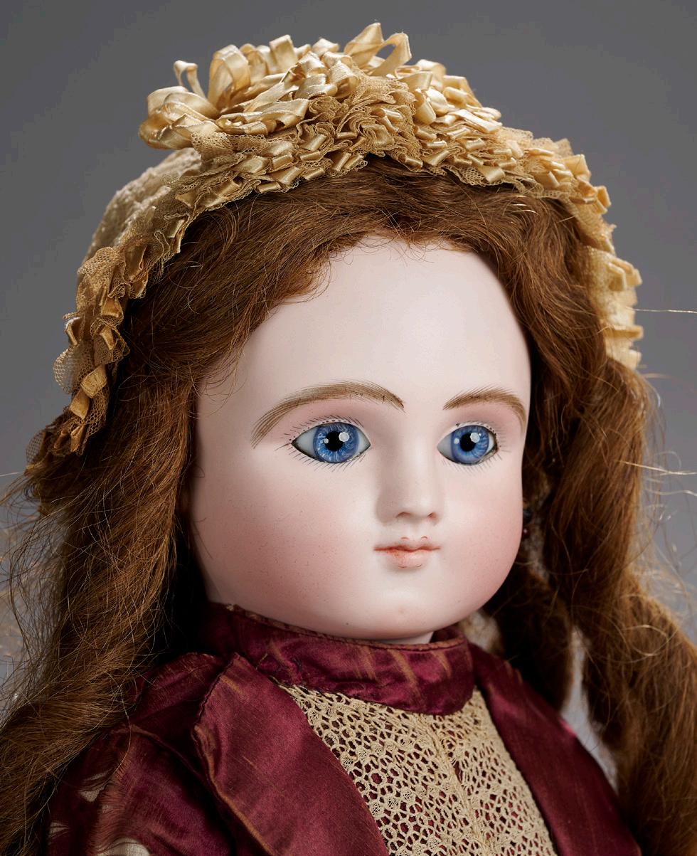 18” (46 cm.) Bisque swivel head on kid-edged bisque shoulderplate, large blue glass paperweight inset eyes, dark eyeliner, painted lashes, feathered brows, rose blushed eye shadow, accented nostrils, closed mouth with center accent line, blonde mohair wig over cork pate, kid gusset-jointed poupée body. Condition: generally excellent.