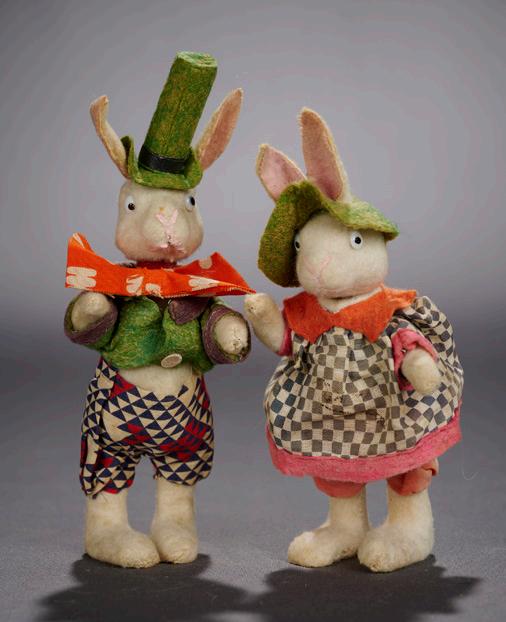 16” (41 cm.) Yellow plush bunny with bright amber disc eyes and rubber tipped nose is posed standing, its ears lined with rose satin, wearing original costume comprising yellow felt top hat with green/white striped banding, purple flannel jacket with ruffled organdy collar and cuffs, yellow felt vest, patterned cotton pants. Condition: excellent. Marks: It’s a Wonderful Toy, It’s Ideal (tag). Comments: Ideal, 1950s. Value Points: vibrant colors and design on the wonderfullycostumed bunny, original label. $200/300