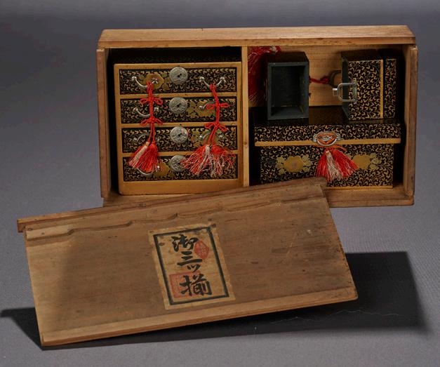 9” (23 cm.) l. 6”h. The carton box in the shape of a bombe-shaped chest of drawers with gold-edging and lithographed paper finish to simulate inlays, with gilt ormolu feet and gilt metal drawer pulls originated as elegant candy box (boite de bon-bons) from prestigious Parisian confiterie. Excellent condition. French, circa 1875. $400/500