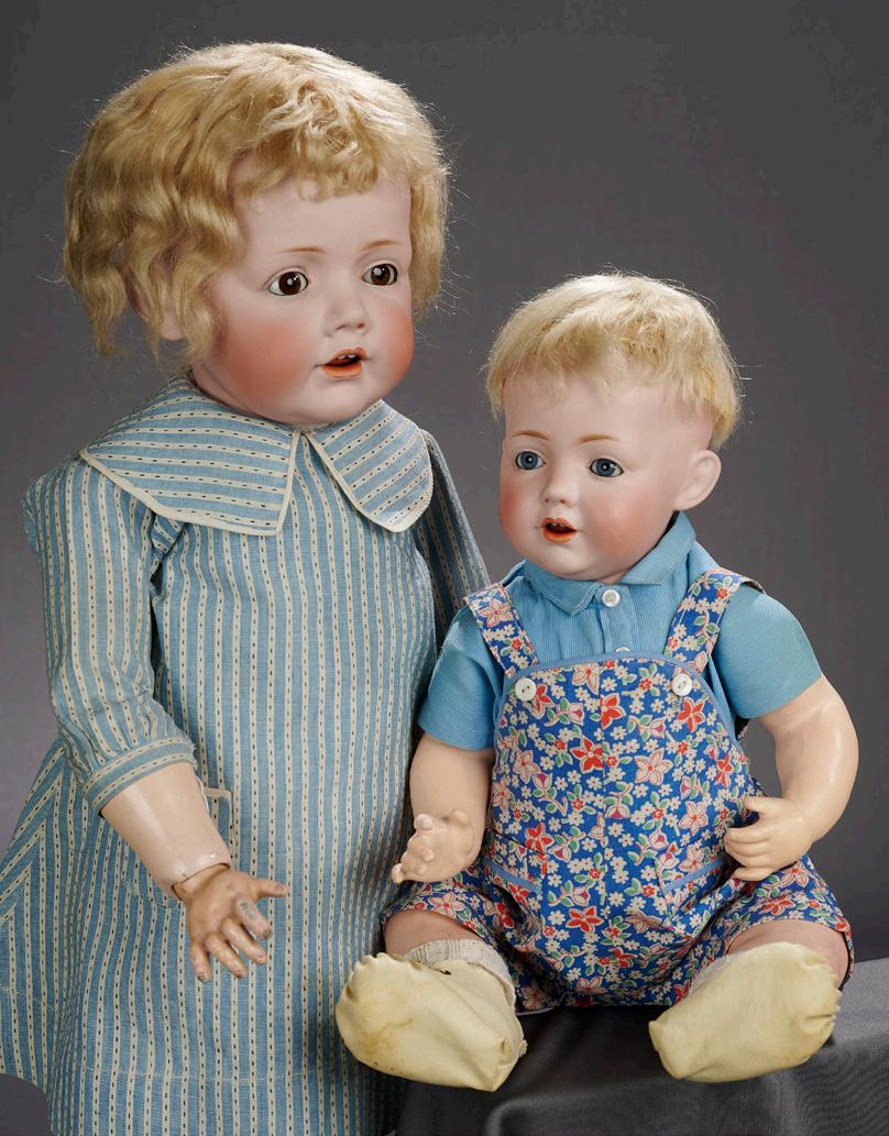 8” (20 cm.) and 8 ½”. Each is all-bisque with one-piece bisque head and torso, blue glass sleep eyes, painted lashes, brushstroked brows, accented nostrils and eye corners, open mouth, four porcelain teeth, blonde mohair wig, loop-jointed bisque arms and legs. Condition: generally excellent. Marks: 150 2 ½ (or 3). Comments: Kestner, circa 1900. Value Points: the sister dolls having variation of pink or blue knee-high stockings. $500/800