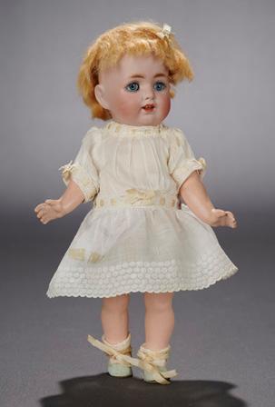 10” (25 cm.) Bisque socket head, blue glass inset eyes, painted lashes and brows, open mouth, four porcelain upper teeth, blonde mohair wig,