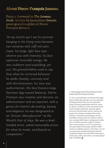 About Pierre-François Jumeau From a foreword to The Jumeau Book, written by Jacqueline Grenier, great-granddaughter of Pierre François Jumeau “In my mind’s eye I see his portrait hanging in the living room between two windows with stiff red satin ropes: his large, light blue eyes observe you with intensity, his face expresses invincible energy. He was stubborn and unyielding, yet just. His grandchildren used to say that when he corrected behavior he spoke sharply, concisely and with discrimination; his tone was authoritarian. His best friend a large Pyrenees dog named Balarias. PierreFrançois was creative and decisive, an administrator and an exporter, with a genius for interior decorating, beauty and elegance: he was designated as an “Artistic Manufacturer” at the World’s Fair of 1849. He was a levelheaded artist, asked reasonable prices for what he made, and feared no competition.” 8
