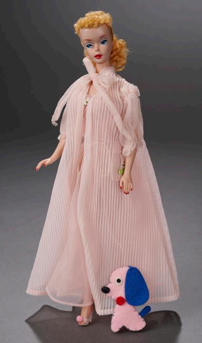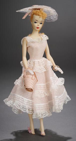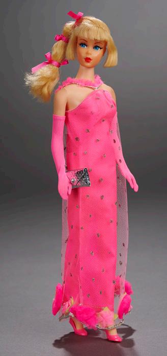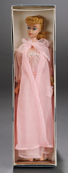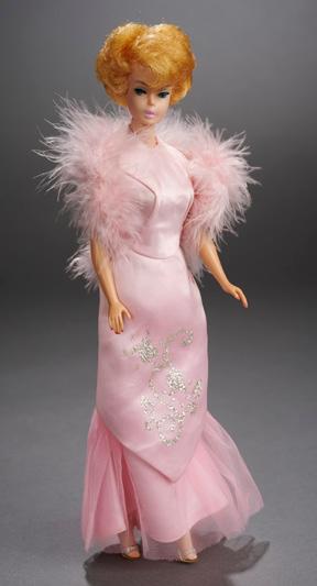 11.5” (29 cm.) Blonde ponytail hairstyle has been arranged in an up-do that is held with original cellophane and a ring of cardboard, soft curly bangs, beautiful face with curved brows, blue side-glancing eyes, smoky shadow, full red lips, lavish blush, solid torso body with nail polish, wearing 1960 “Enchanted Evening” #983 costume with pink dress with long white gloves, necklace, shoes. Excellent condition. Mattel, 1960. Includes original slender box in pink with gray and white silhouettes with neck and ankle braces, there is a circular label on the end stating #983 “Enchanted Evening,” very few examples of actual Mattel created “up-dos” exist, and this is a stunning example. $900/1100