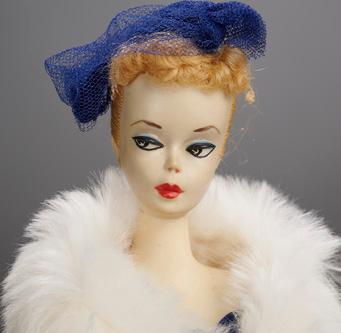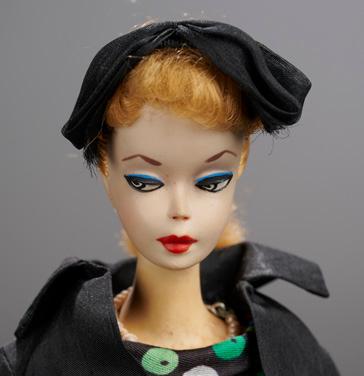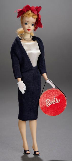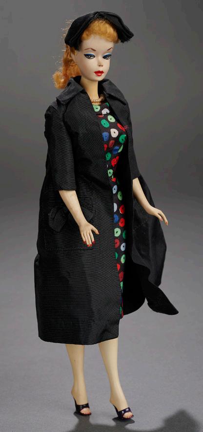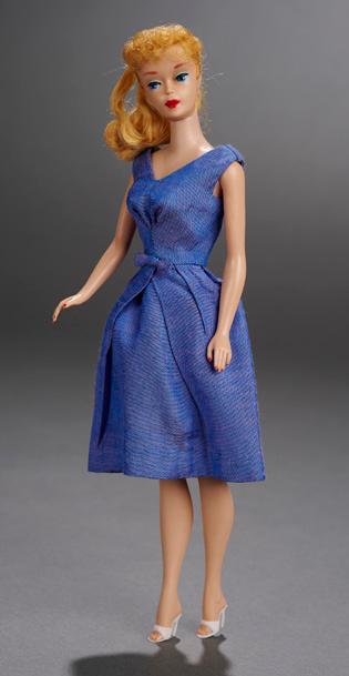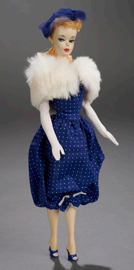 11.5” (29 cm.) Blonde ponytail hairstyle with soft curly bangs, arched eyebrows, black and white painted eyes, red full lips, solid torso body with painted nails and pale skin tone, wearing “Gay Parisienne” costume with navy blue dotted bubble dress, white fur stole, long white gloves, tulle hat, and open toe navy blue pumps with holes to accommodate the #1 posing stand. Excellent condition. Mattel, 1959. Essentially the same doll as the #1, however without the holes in the feet, and actually more difficult to find. $6000/8000