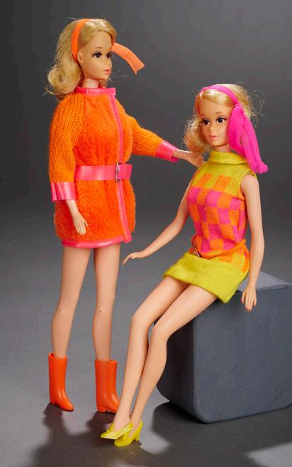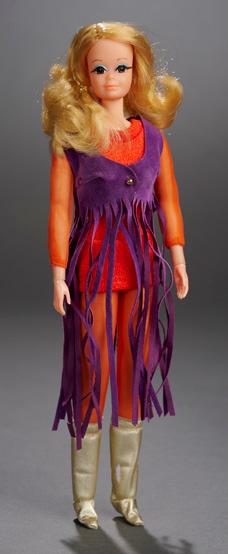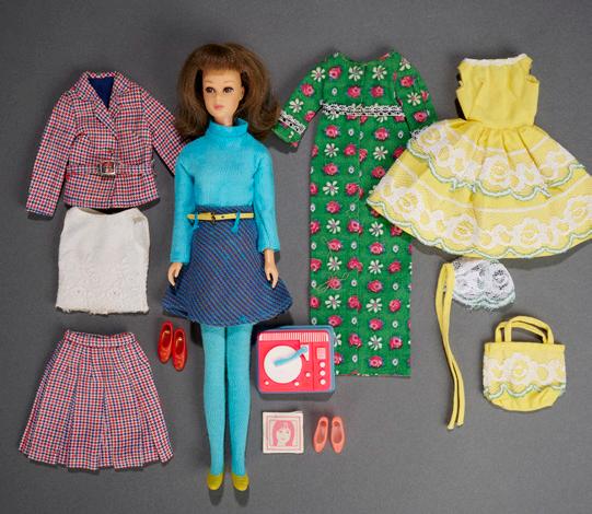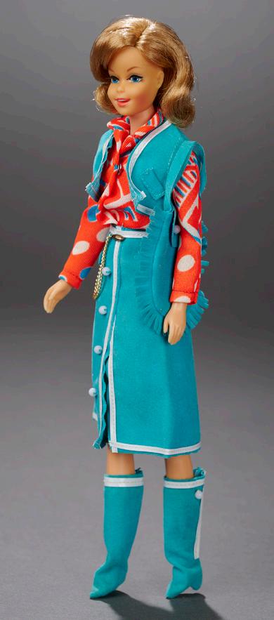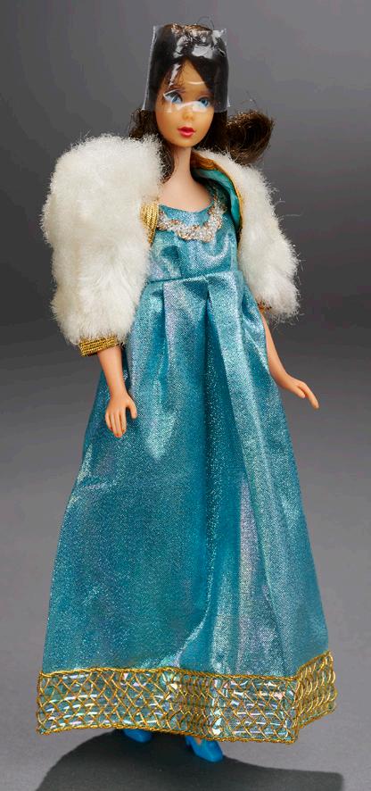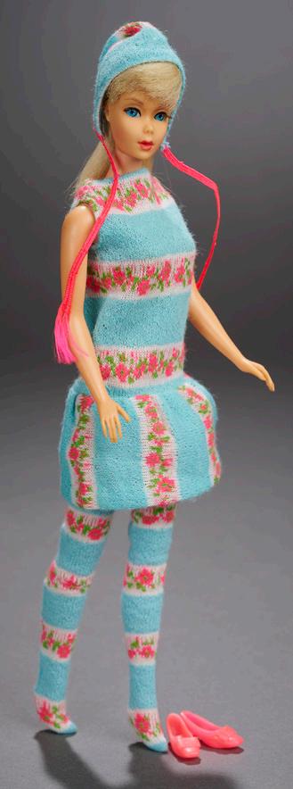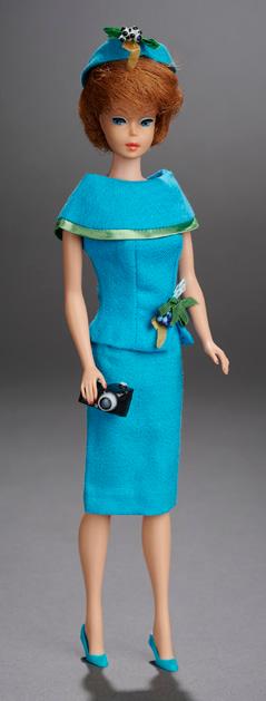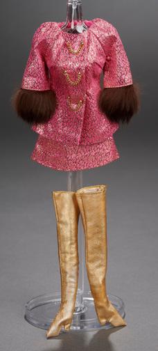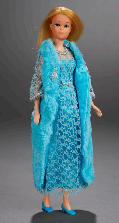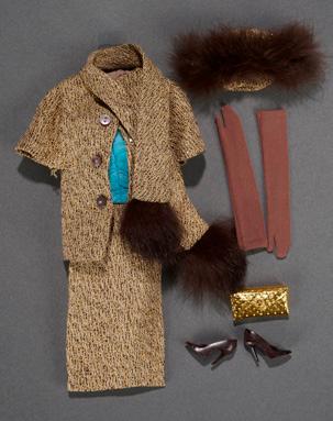 11.5” (29 cm.) Gold tweed jacket with fur trimmed scarf, matching hat, sheath dress with tweed skirt and blue chiffon top, long brown gloves, and hard to find brown spike heels. Excellent condition. Mattel, 1965. $200/300