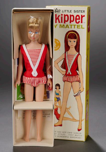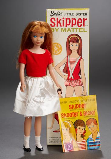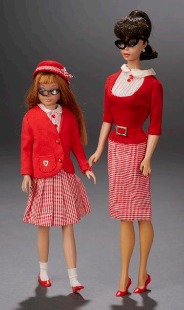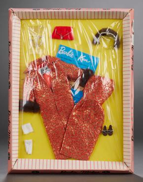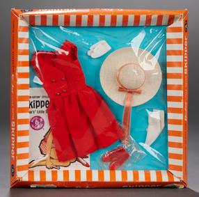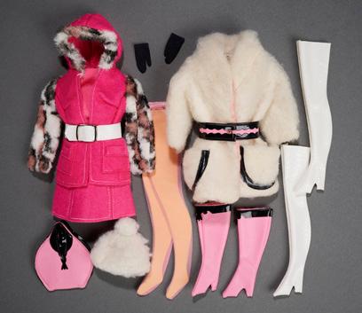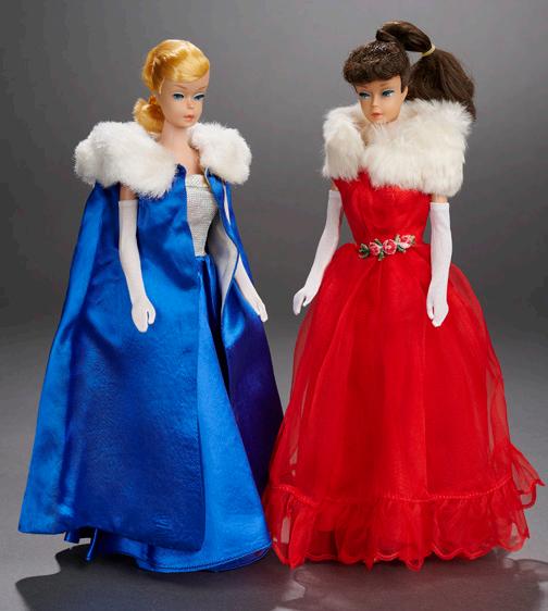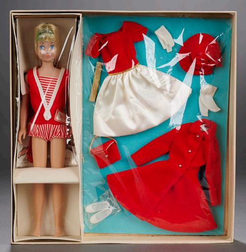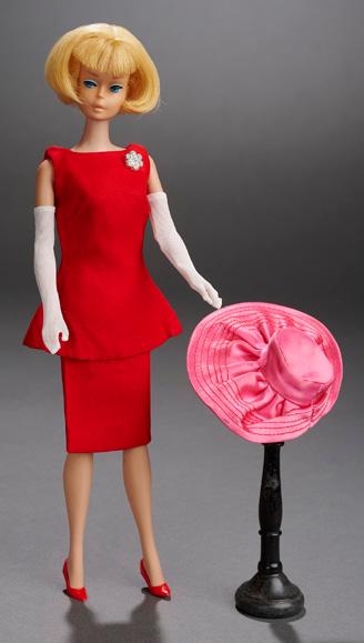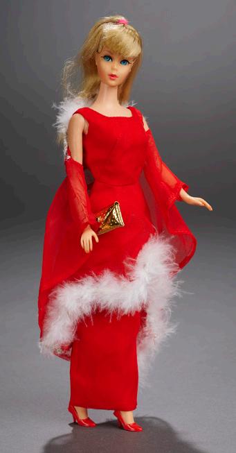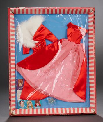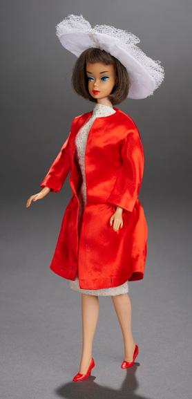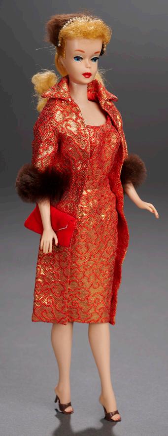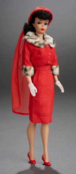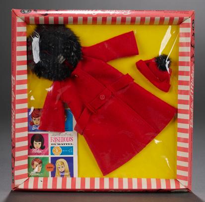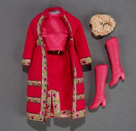11.5” (29 cm.) Red brocade dress with matching fur trimmed coat, fur hat, velvet purse, pearl jewelry, handkerchief, white gloves, and brown open toe heels. Near mint condition, minor wear to package. Mattel, 1963. Presented in original unopened package with fashion booklet. $200/300