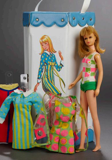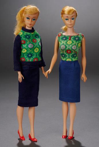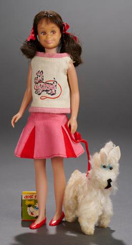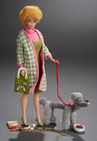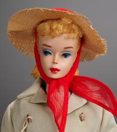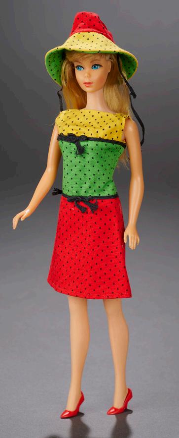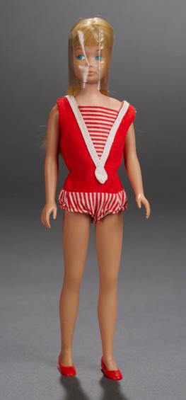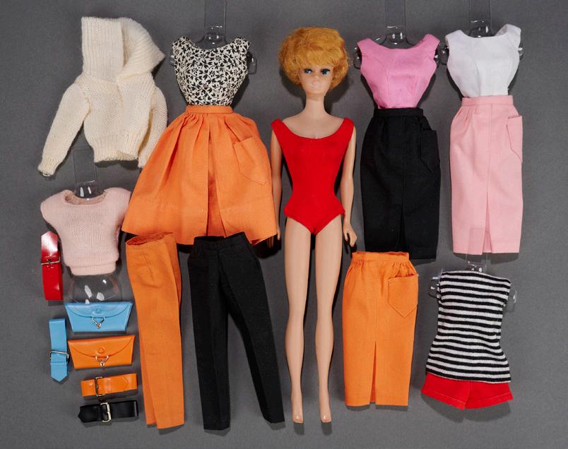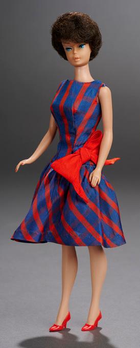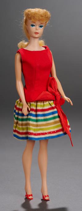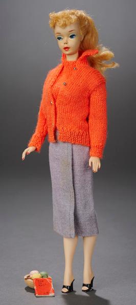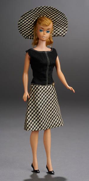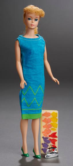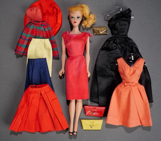 11.5” (29 cm.) Blonde ponytail with firm textured bangs, curved eyebrows, blue side-glancing eyes, full red lips, solid torso body like that of a #4 doll with straight legs, red nail polish. Includes Pak clothing pieces with Red Delight sheath dress, bell dress, black satin separates, skirt styles in plaid and yellow cotton, and extra accessories. Excellent condition. Mattel, doll is 1961, clothing is 1963-66. $300/400