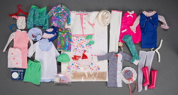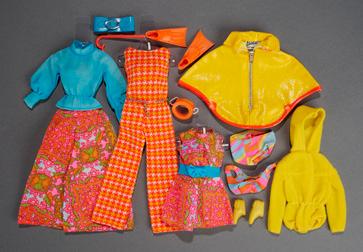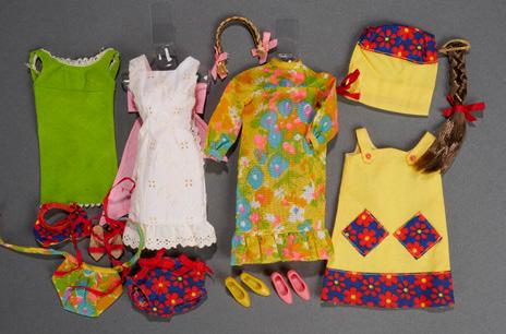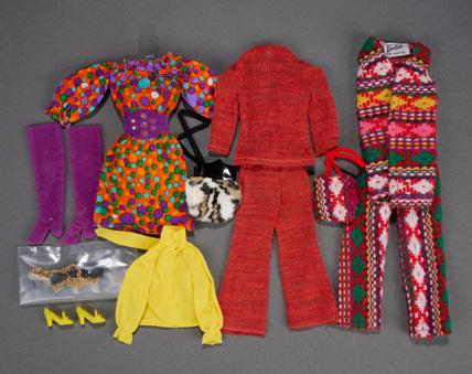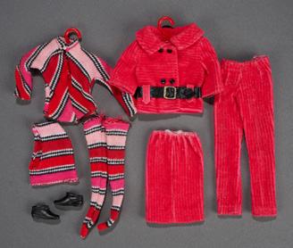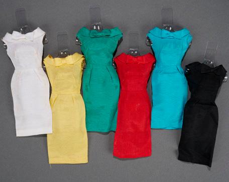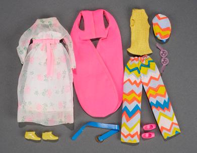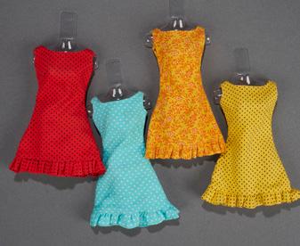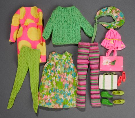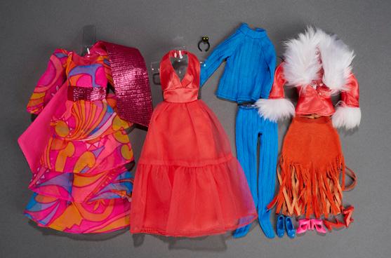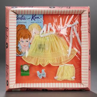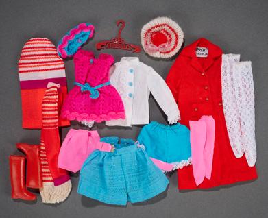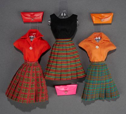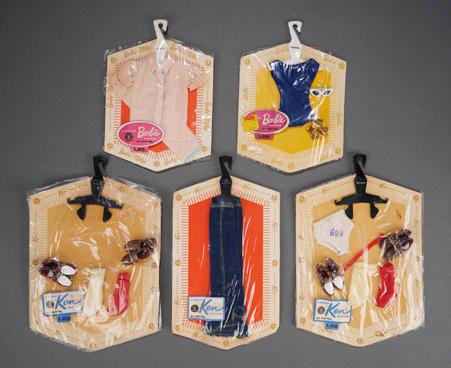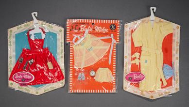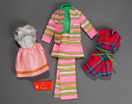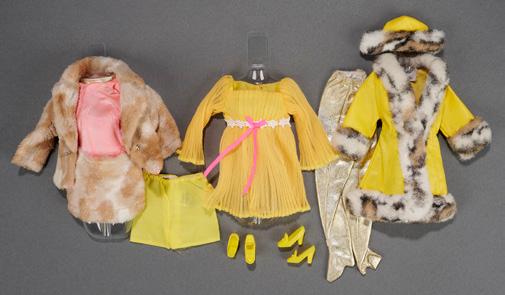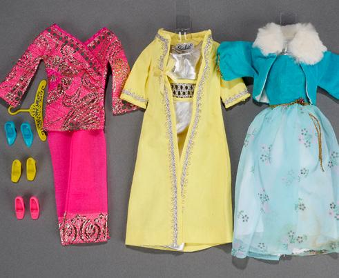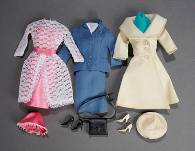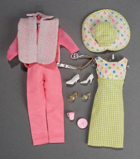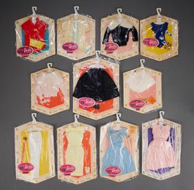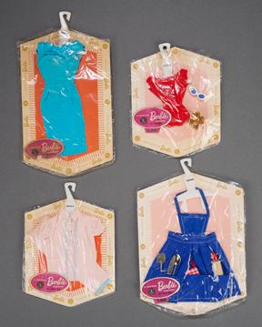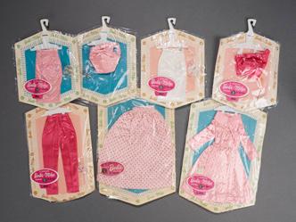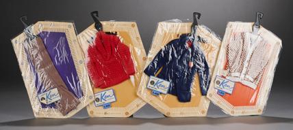 sweater, yellow silk sheath dress, pink cardigan sweater, black full skirt, and pink bell dress. Excellent condition, some wear to cellophane. Mattel, 1962-64. All are in their original packaging. $300/400