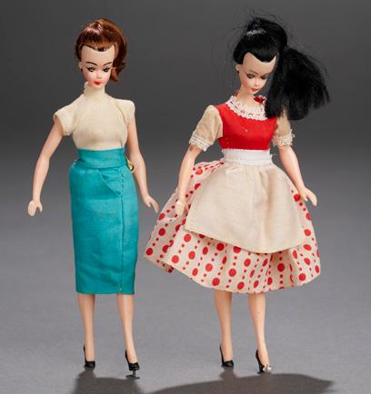 7” (18 cm.) Dark brunette ponytail hairstyle, arched brows, black eyes, red lips and blush, strung hard plastic body, molded shoes, wearing blouse and blue cotton skirt. Costume has a sticker marked “Made in Hong Kong.” The companion doll has black ponytail hairstyle, arched brows, black eyes, blush, red lips, strung hard plastic body, red print dress with apron. Very good condition, black haired doll has chip on toe. Both dolls marked “U.S. Patent 2925684, British Patent 804566, Made in Hong Kong.” Unknown maker, c.1960s. Hard to find petite size dolls in these hair colors. $100/200