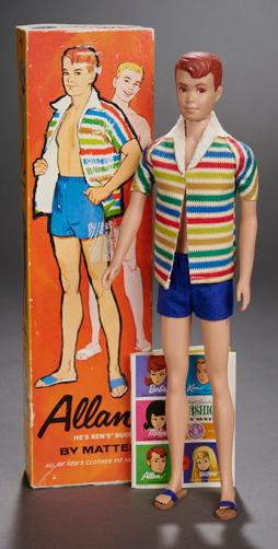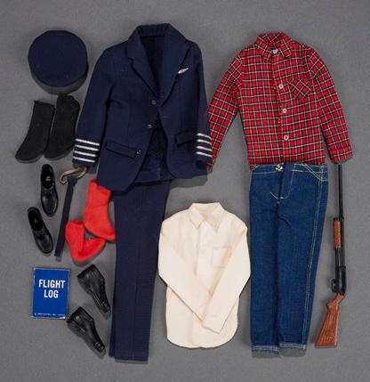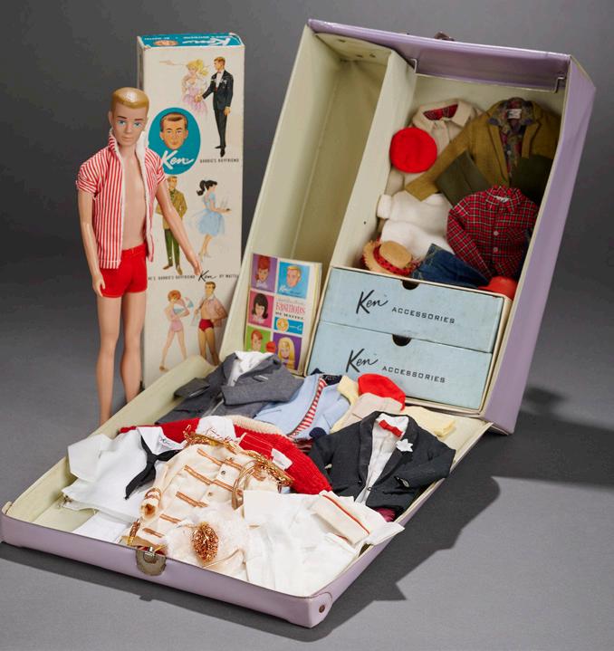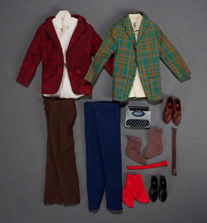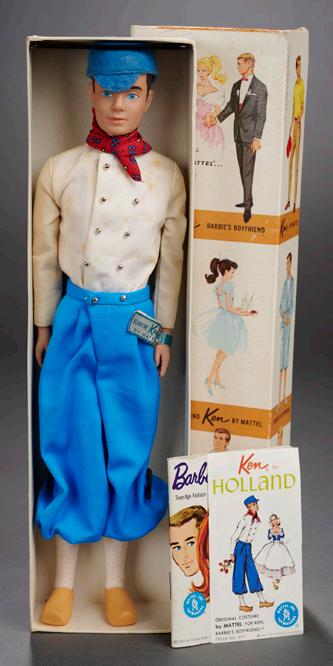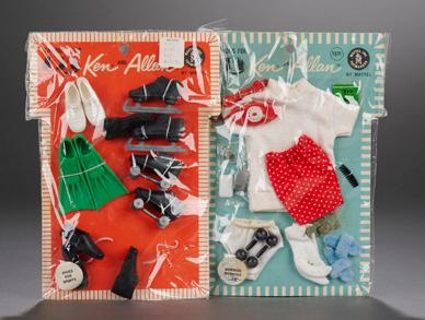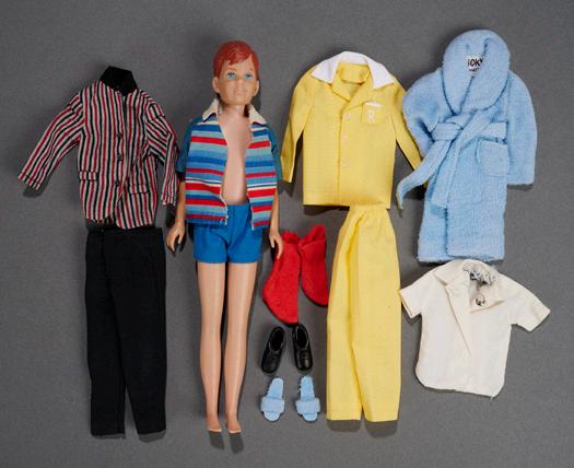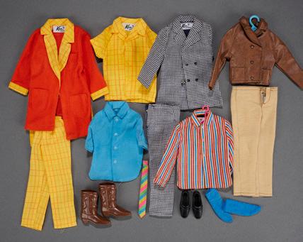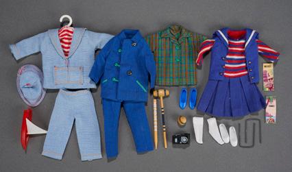 blue eyes, coral lip color, straight leg body wearing beach jacket and swimsuit. Along with lavender vinyl carrying case with Ken logo and illustrations that is full of original costumes including: “Yachtsman” #789, “Going Hunting” #1409, “Saturday Date” #786, “Rally Day” #788, “Drum Major” #775, “Dreamboat” #785, and extras. Most are near complete. Excellent condition. Mattel, doll is 1962, costumes are 1961-64. Doll includes posing stand in original box. Wonderful instant collection. $300/400