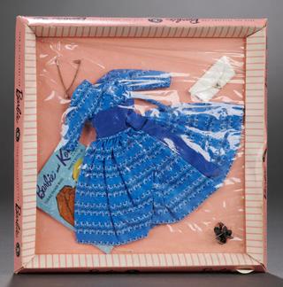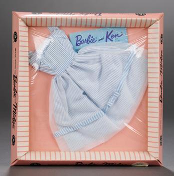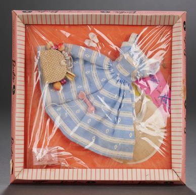 11.5” (29 cm.) Blue pinstripe cotton sundress with sheer nylon overlay accented with small bows. Near mint condition. Mattel, 1962. Includes booklet in original packaging marked “#933 Movie Date.” $100/200
