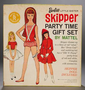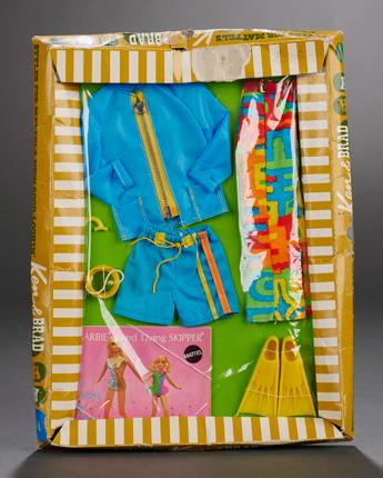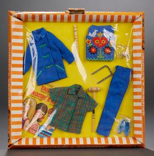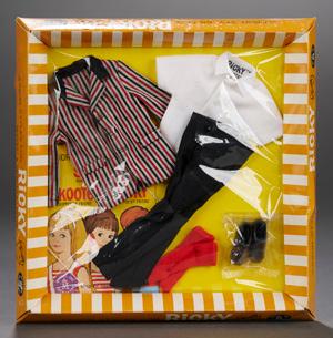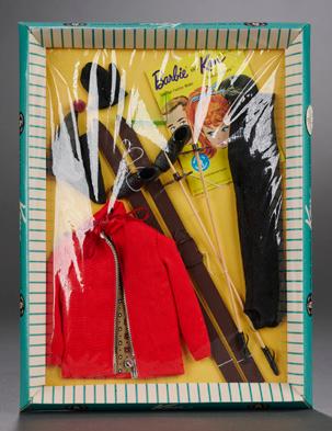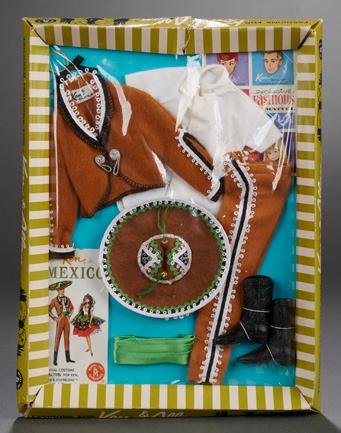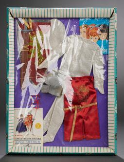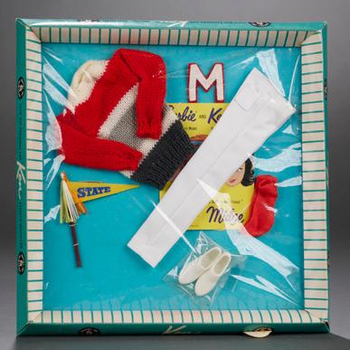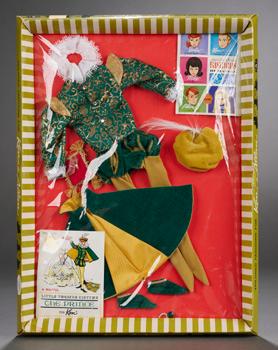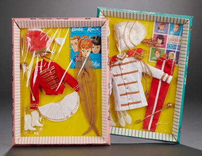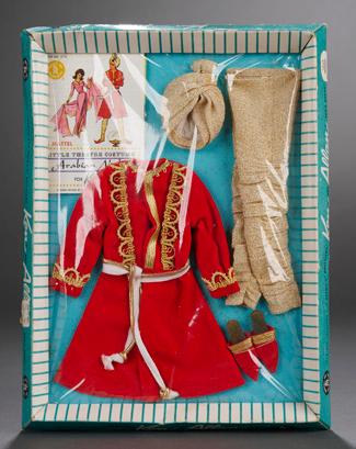 11.5” (29 cm.) Original unopened presentation of “Drum Major,” “Majorette,” and “Cheerleader” costumes as a gift set. Near mint condition, some wear to packaging. Mattel, 1964. Costumes are still attached to card with cellophane, in original box, features coordinating costumes for the three characters. $700/800