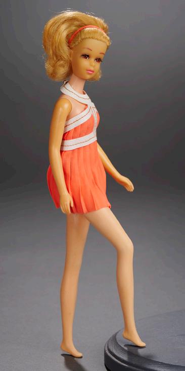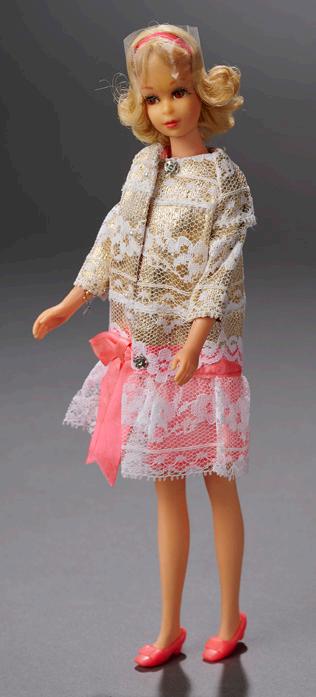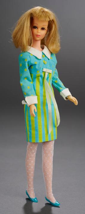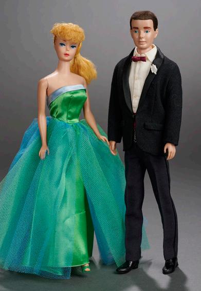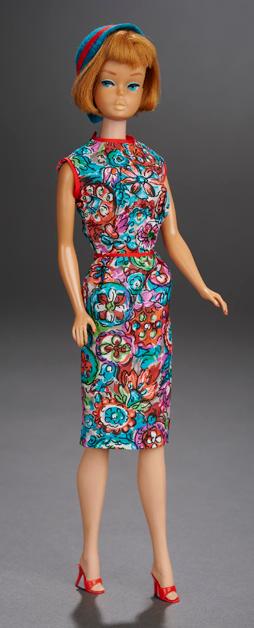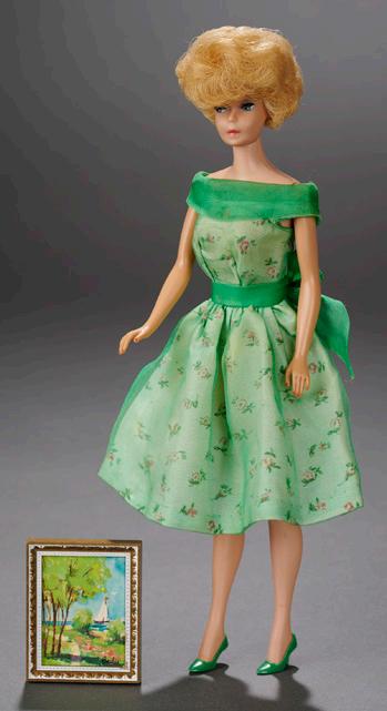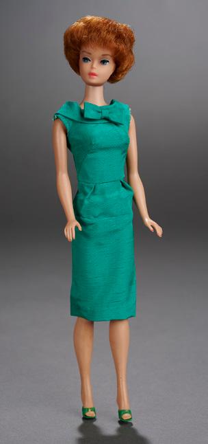 11.5” (29 cm.) Blonde ponytail hairstyle with firm textured curly bangs, curved eyebrows, blue side-glancing eyes, coral lips, straight leg body with nail polish, wearing “Senior Prom” #951 costume with formal dress and green heels. Excellent condition. Mattel, 1963. $200/300