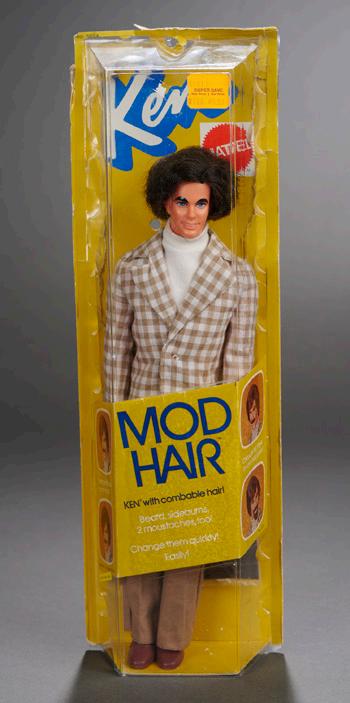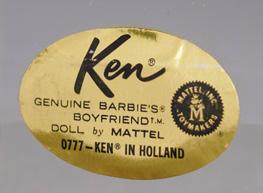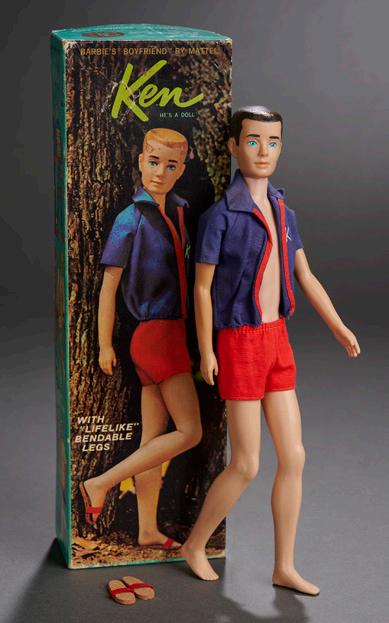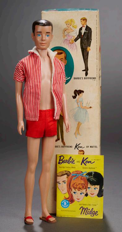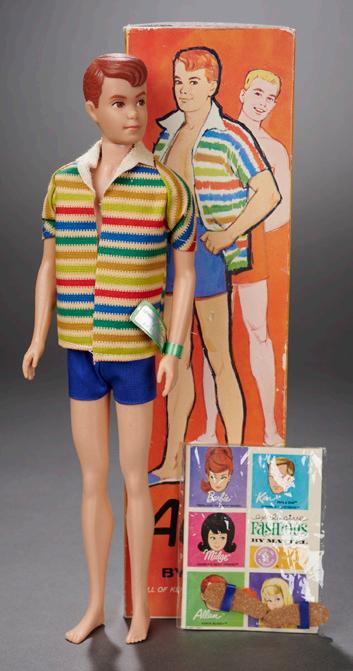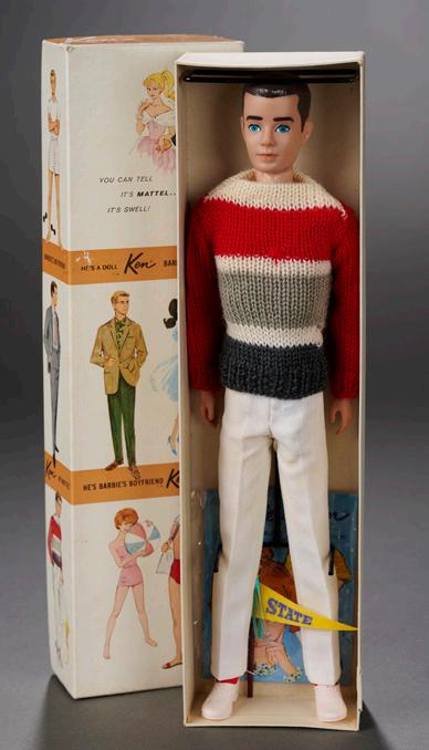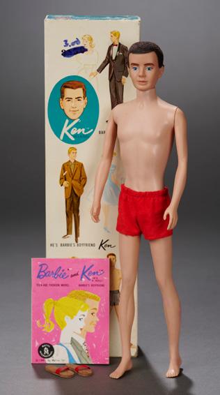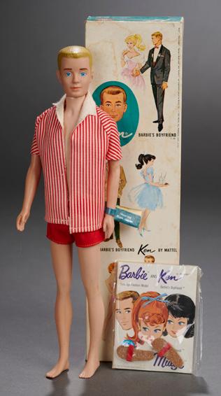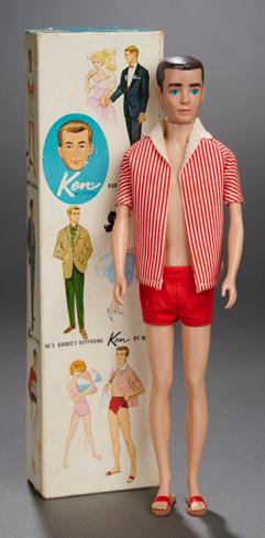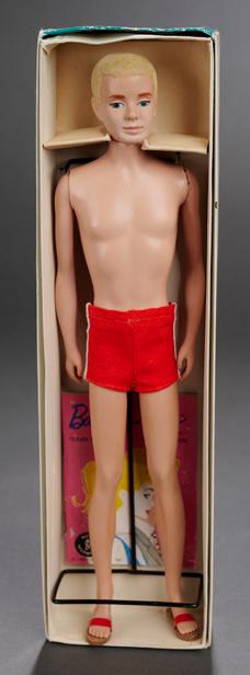 12” (30 cm.) Flocked hair in pale blonde color, brown eyebrows, blue eyes, rose lip color, straight leg body, original beach jacket, swimsuit, towel, cork sandals. Near mint condition, minor wear to box. Mattel, 1961. Includes posing stand, wrist tag and box liner in original box. Fabulous example of an early Ken doll. $200/300