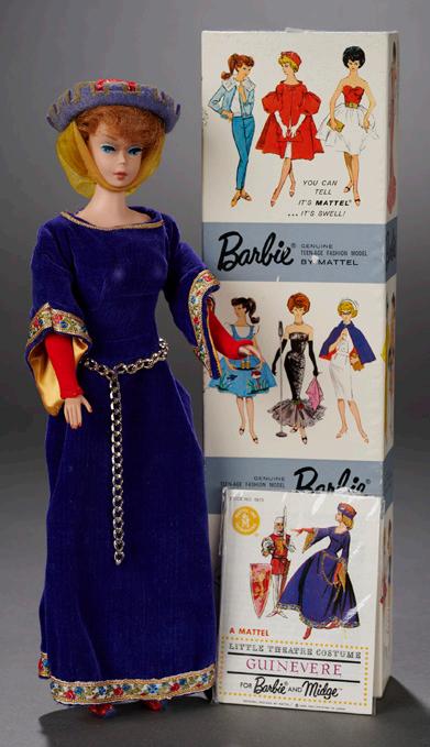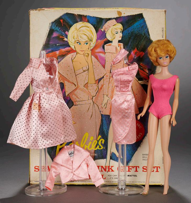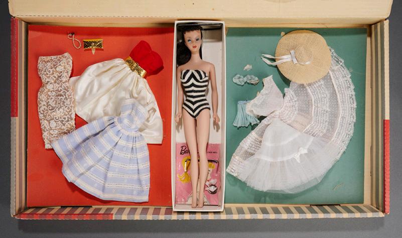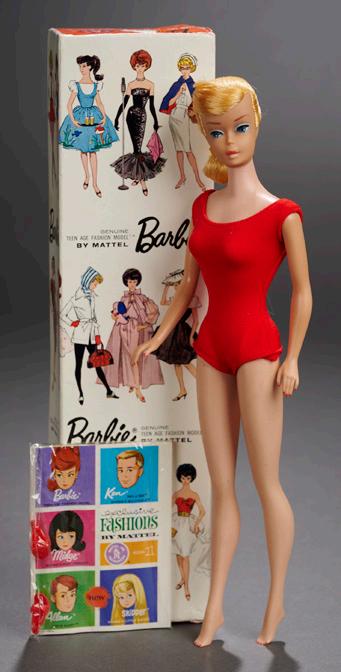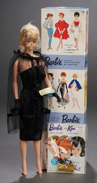hairstyle, firm textured bangs, curved eyebrows, blue side-glancing eyes, red full lips, straight leg body with nail polish, packaged in original presentation with slender doll box with swimsuit, stand, liner, booklet, shoes, reattached wrist tag, two presentation cards with early costume pieces for mix and match. Excellent condition, lid of box is torn and box has minor wear. Mattel, 1961. Presented as originally packaged, wonderful early gift set. $900/1000
