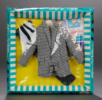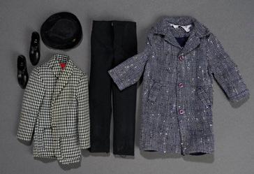 12” (30 cm.) Black houndstooth check jacket, black pants. Near mint condition. Mattel, 1961. Includes booklet in original package with circular label with style number. $100/200
