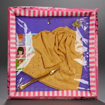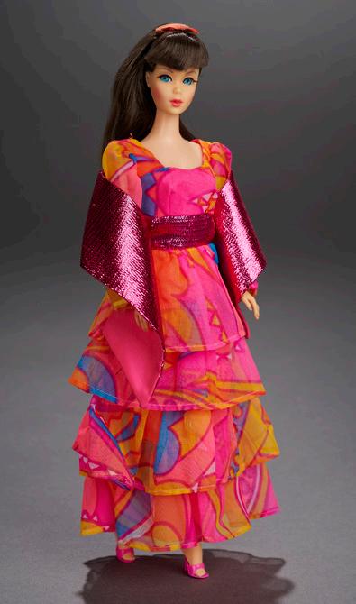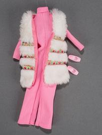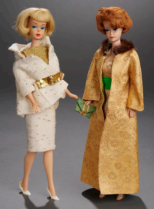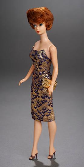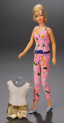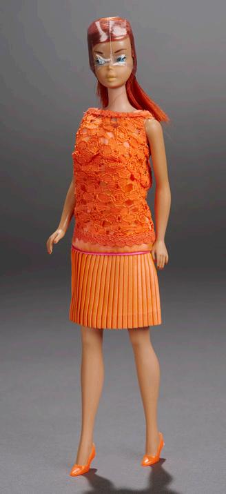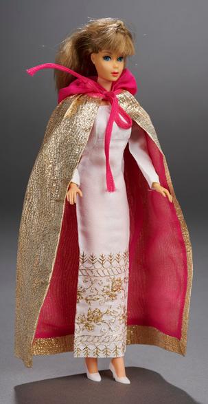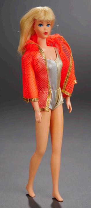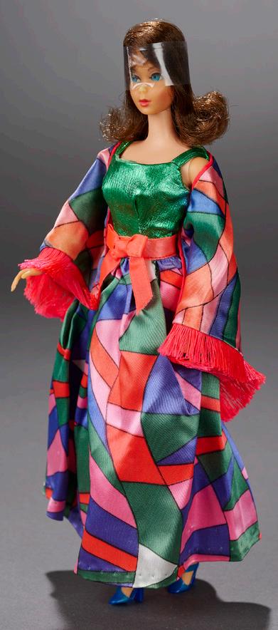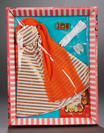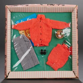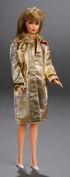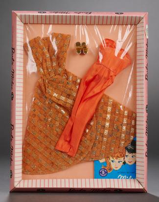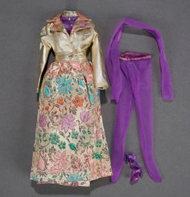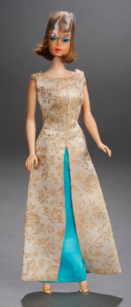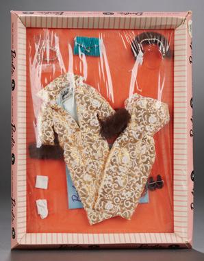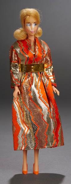 11.5” (29 cm.) Orange taffeta jumpsuit, gold metallic hostess coat, and gold wedge heels. Excellent condition. Mattel, 1963. Presented in original unopened package with booklet. $200/300