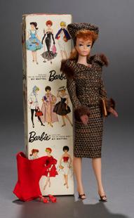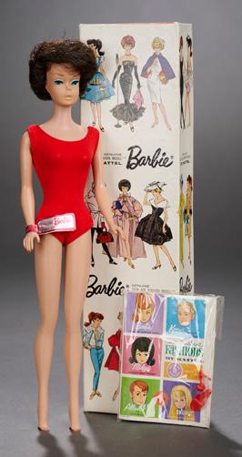 11.5” (29 cm.) Brunette bouffant coiffure with curved eyebrows, blue side-glancing eyes, pale peach lips, straight leg body with nail polish, original red swimsuit, red open toe heels in cello. Excellent condition. Mattel, 1963. Includes original box marked “Brunette Bubble Cut,” reattached wrist tag, booklet in cello, gold wire posing stand, and original liner. $200/300