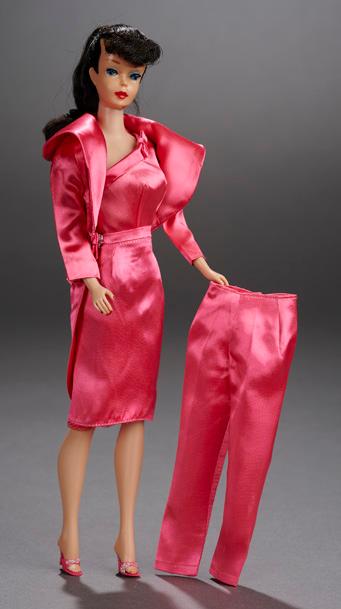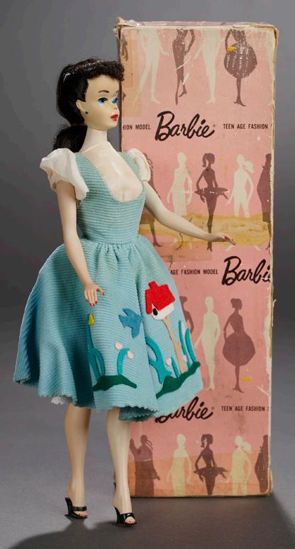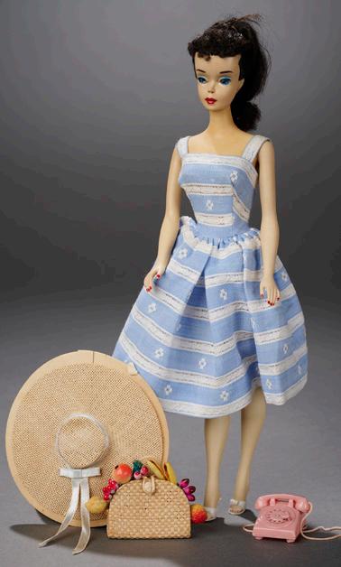 11.5” (29 cm.) Brunette ponytail hairstyle with soft curly bangs, curved eyebrows, blue sideglancing eyes, solid torso body with straight legs and nail polish, wearing original swimsuit and heels. Along with blue vinyl case with early costumes including: “Picnic Set” #967, “Friday Nite Date” #979, “Dinner at Eight” #946, “Solo in the Spotlight” #982, “Drum Majorette” #875, “Bride’s Dream” #947, “Masquerade” #947, and “Sweet Dreams” #973 (in pink). Most are near complete. Excellent condition. Mattel, doll is 1960, costumes are 1959-63. Doll includes posing stand in original box. $400/500