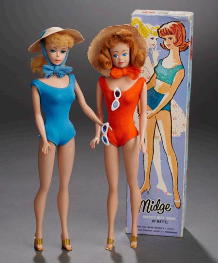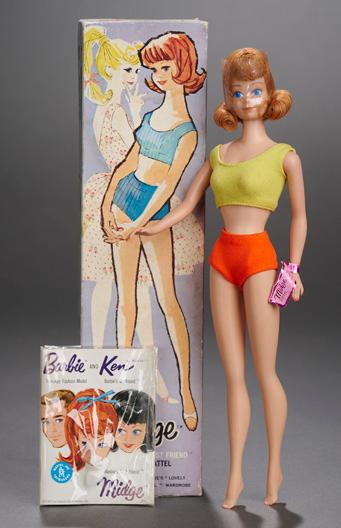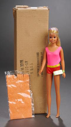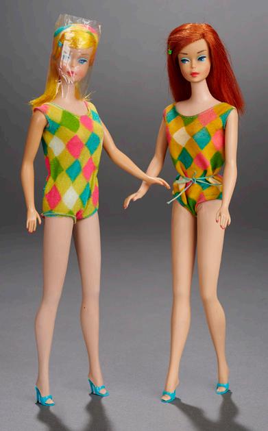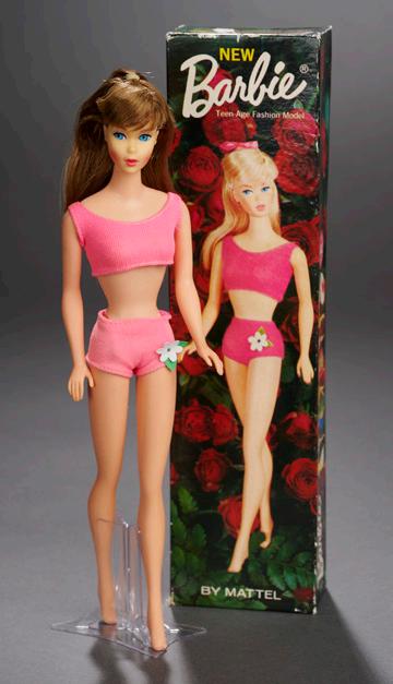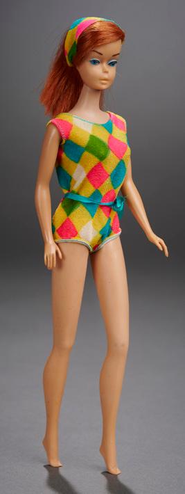 12” (30 cm.) Molded red hair, brown eyes, coral lips, straight leg body, wearing original beach jacket, blue swimsuit, cork sandals Excellent condition. Mattel, 1964. Includes posing stand and booklet, all in original box. $100/200