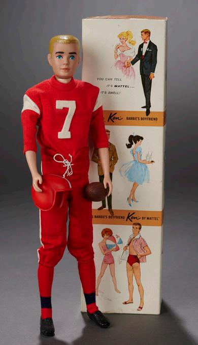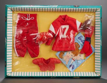 “Touchdown!” #799 Costume for Ken Doll in Original Package 12” (30 cm.) Red football uniform with jersey and pants, shoulder pads, helmet, socks, cleats, and football. Excellent condition, cellophane is torn and shoulder pads are loose. Mattel, 1963. Presented in original package with booklet. $100/200