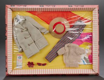 11.5” (29 cm.) Tan car coat with toggles, sweater, striped pants, straw hat with red scarf, cork wedge heels, road map. Near mint condition. Mattel, 1961. Includes booklet in unopened package with circular label stating “#985 Open Road.” $300/400
