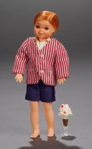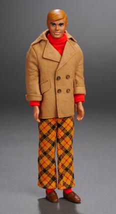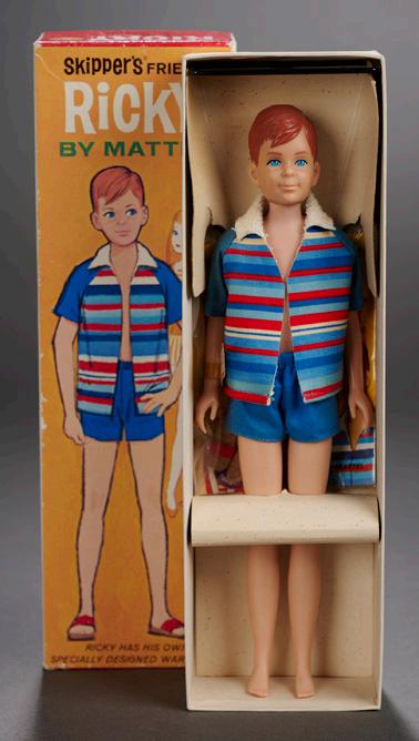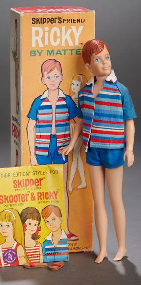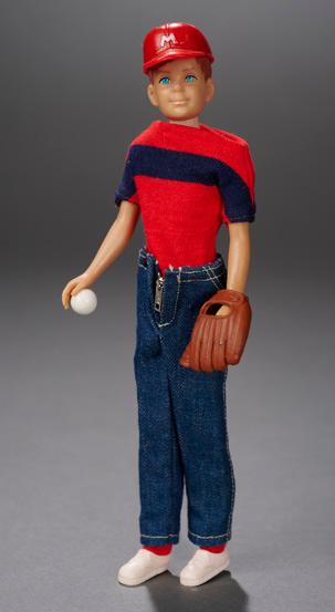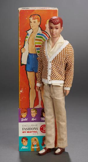 12” (30 cm.) Red molded hair, brown eyes, coral lips, straight leg body, wearing brown sweater, cream colored short sleeve shirt, khaki pants, and brown shoes. Excellent condition, box has some splits in corners. Mattel, 1964. Includes posing stand and booklet in original box. $100/200