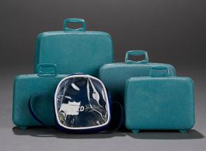 11.5” (29 cm.) Molded plastic luggage with two large and two medium suitcases and a vinyl “United” logo zipper bag. Excellent condition. Patton, under license to use the “Samsonite Silhouette” style and name, 1964.