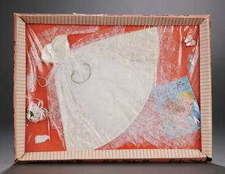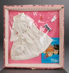11.5” (29 cm.) White satin and sheer gown with veil, long white gloves, bouquet, pearl necklace, garter, and white open toe heels. Near mint condition, some wear to package. Mattel, 1963. Presented in original unopened package with booklet. $200/300