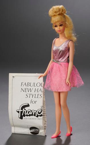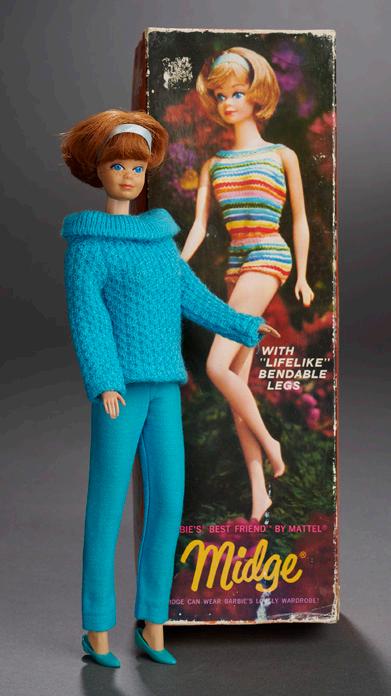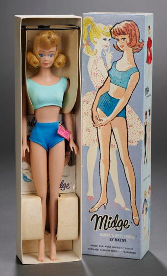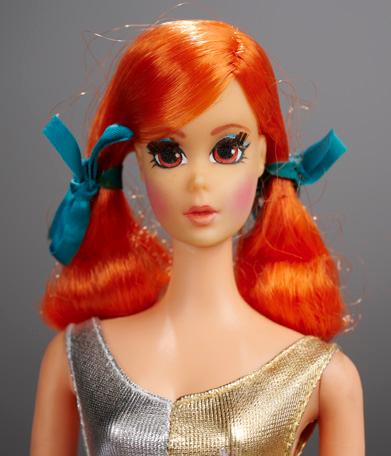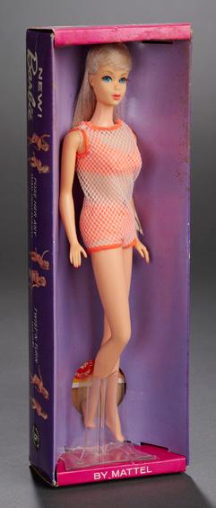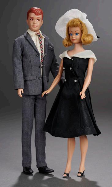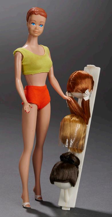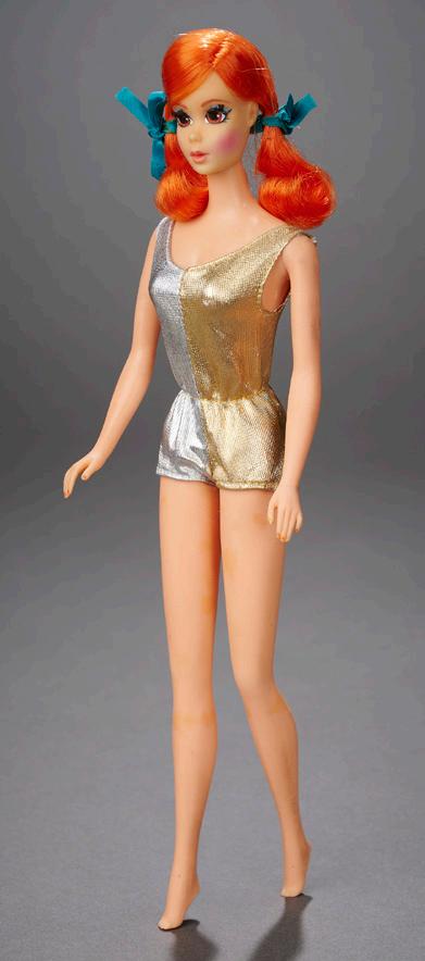 11.5” (29 cm.) Pale blonde bouffant coiffure, curved eyebrows, blue side-glancing eyes, pale pink full lips, straight leg body with red nail polish, black and white swimsuit, sunglasses, black heels. Excellent condition. Mattel, 1961. Includes booklet, and posing stand, original box with stamp stating “White Ginger.” $300/400