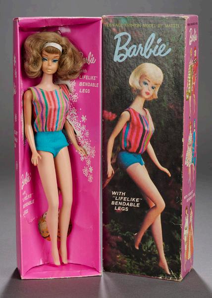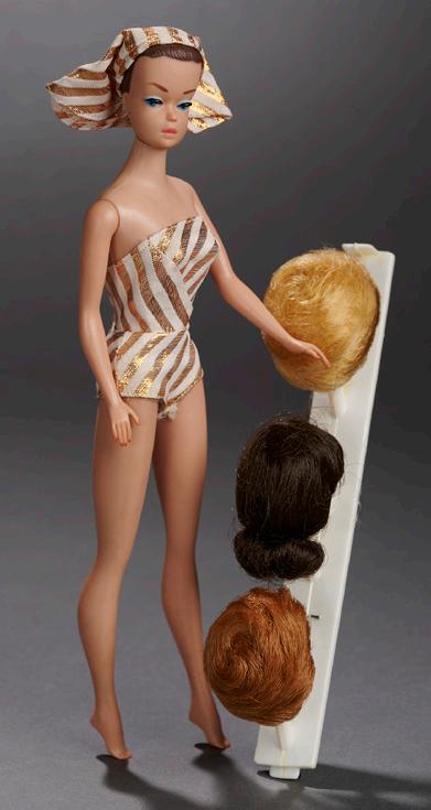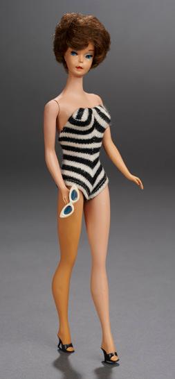 11.5” (29 cm.) Blonde ponytail hairstyle with firm textured bangs, curved eyebrows, blue side-glancing eyes, accented nostrils, full red lips, straight leg body with nail polish, black and white swimsuit, sunglasses, black heels. Excellent condition. Mattel, 1961. Includes booklet and posing stand in original box. $200/300