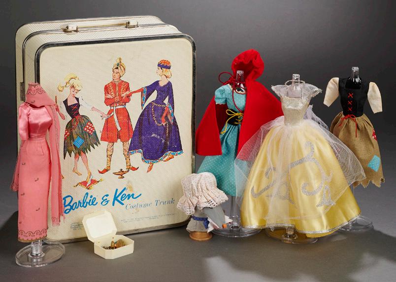 11.5” (29 cm.) Hard plastic carrying case illustrated with images from the Mattel Little Theater Costumes. Designed to hold three dolls and costumes. It includes: Barbie costumes “Arabian Nights” #874, “Red Riding Hood” #880, and “Cinderella” #872. Very good condition, some melt marks on the trunk and interior which is typical for this material. Mattel, 1964. Trunk by Standard Plastic Products. Hard to find variation of trunk.
