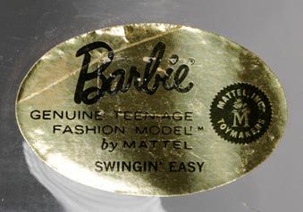 box with blue bands and label on the end with “Swingin’ Easy” sticker, interior clear cello with gold foil label with Barbie logo also marked with costume name, includes posing stand and booklet. $300/400