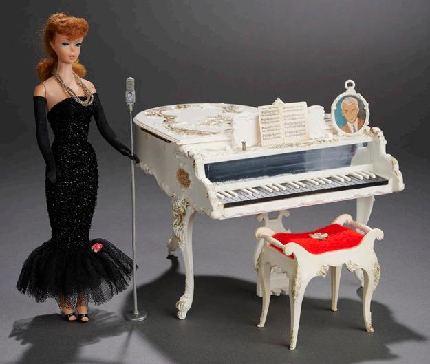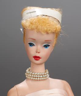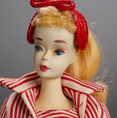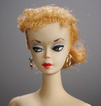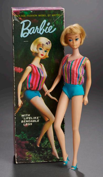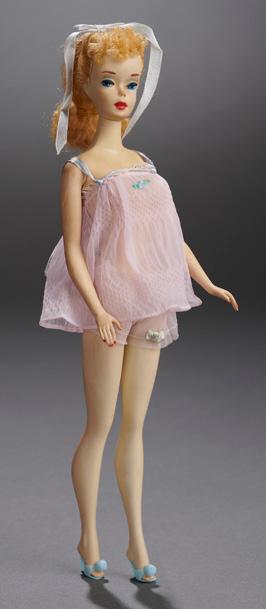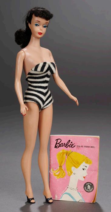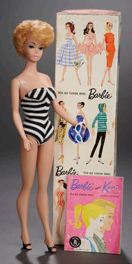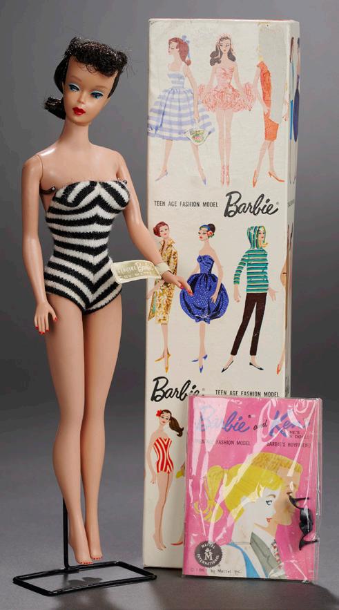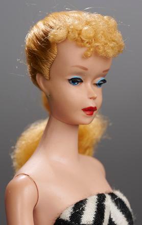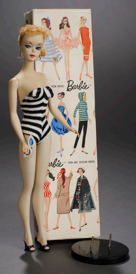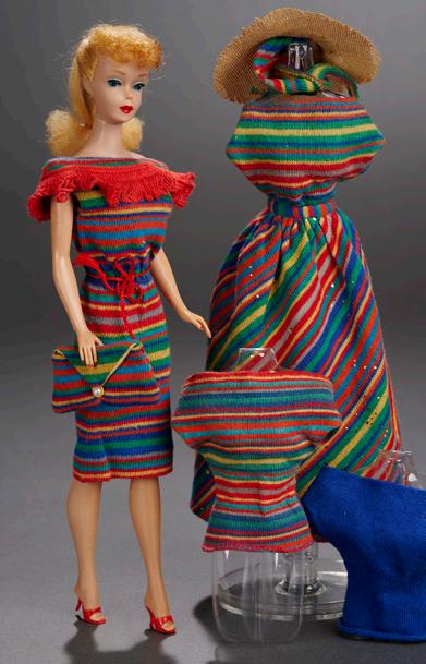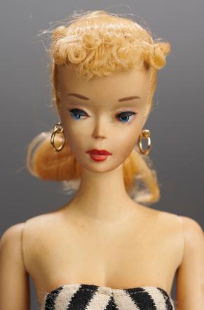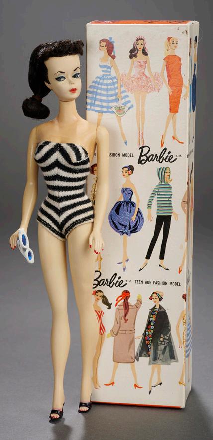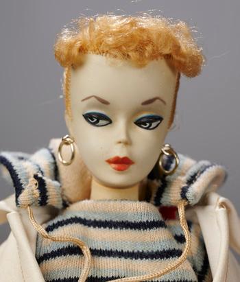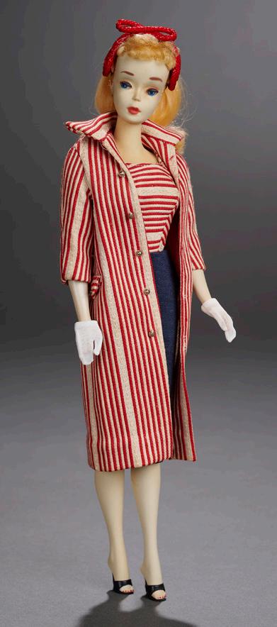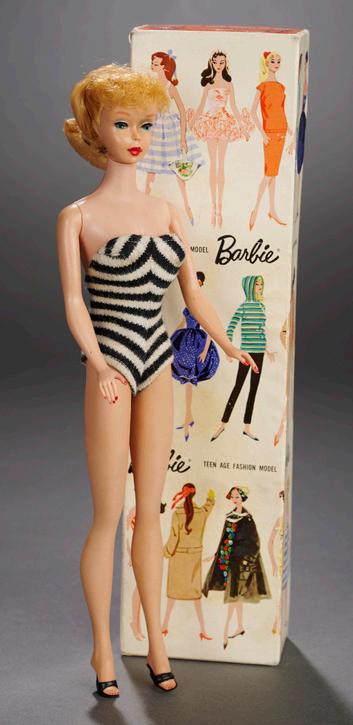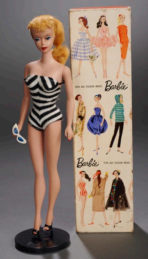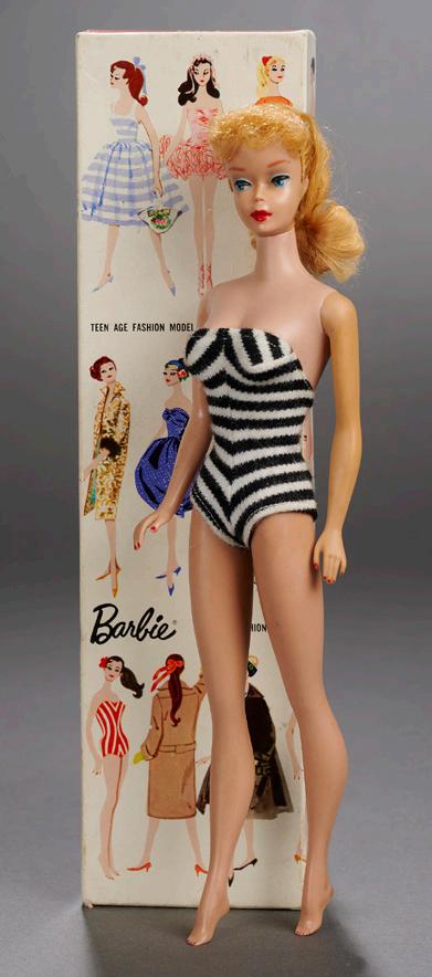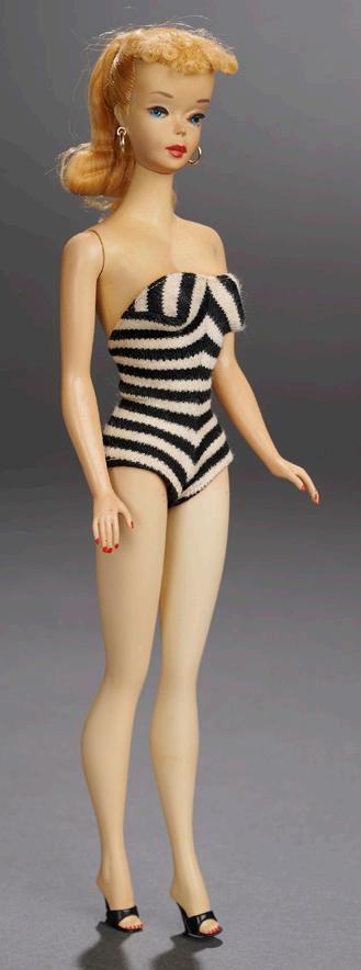 11.5” (29 cm.) Blonde ponytail hairstyle in original set with soft curly bangs, curved eyebrows, blue side-glancing eyes with brown eyeliner, full red lips, blush, solid torso body with pale complexion and painted nail polish, wearing black and white striped swimsuit, heels, gold hoop earrings. Excellent condition. Mattel, 1959. Includes pedestal posing stand, stunning early doll. $800/900
