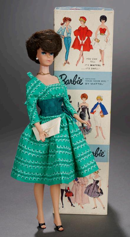 11.5” (29 cm.) Brunette bouffant hairstyle, curved eyebrows, blue side-glancing eyes, pale coral lips, straight leg body, wearing green dress with sash, pearl drop necklace, white vinyl clutch purse and black open toe pumps. Excellent condition, some cracks to clear cello lid and minor wear to box. Mattel, 1964. In original 23.