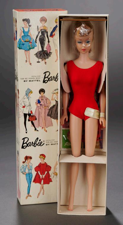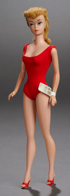 11.5” (29 cm.) Ash blonde ponytail hairstyle with firm textured bangs, curved eyebrows, blue sideglancing eyes, coral lips, straight leg body with nail polish, wearing red swimsuit and red open toe heels. Excellent condition, box has some wear. Mattel, 1963. Includes wrist tag, booklet, and black wire posing stand in original box marked “Ash Blonde Ponytail.” $200/300
