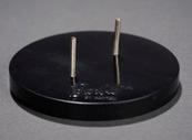 11.5” (29 cm.) Brunette Ponytail hairstyle with soft curly bangs, curved eyebrows, blue side-glancing eyes, solid torso body with nail polish, original black and white swimsuit, sunglasses, black open toe heels. Excellent condition. Mattel, 1960. Along with pedestal posing stand and presented
