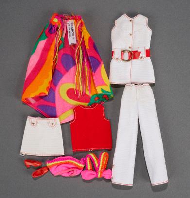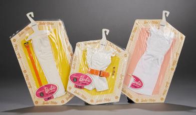 11.5” (29 cm.) White cotton playsuit with orange wide vinyl belt and charm bracelet, white pants with orange vinyl belt, and white silk sheath dress. Near mint condition. Mattel, 1962. Presented in original packaging, $150/200