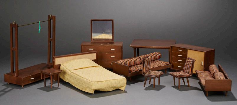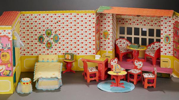 20” (51 cm.) Cardboard fold-out structure creates three distinct areas comprising living room with sofa, chairs, coffee table; kitchen with cabinets, small table and chairs; and bedroom with nightstand, bed, closet, lamp, patio with chaise lounge, and wall. Very good condition, some play wear to furniture pieces. Mattel, 1964. The set is considered the ultimate vintage structure for displaying Barbie family dolls.