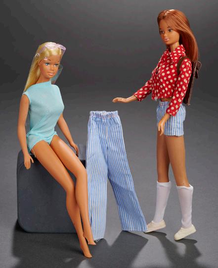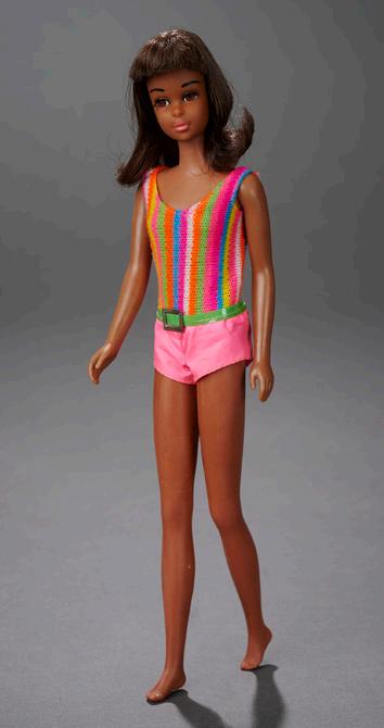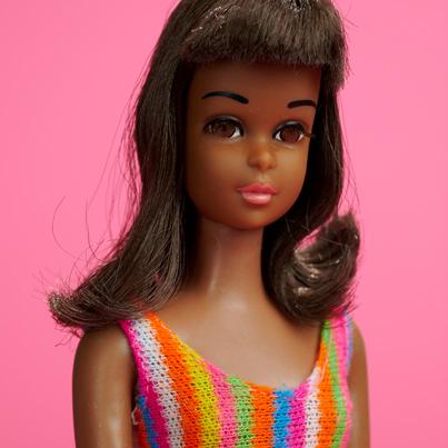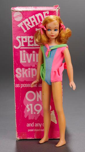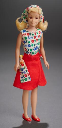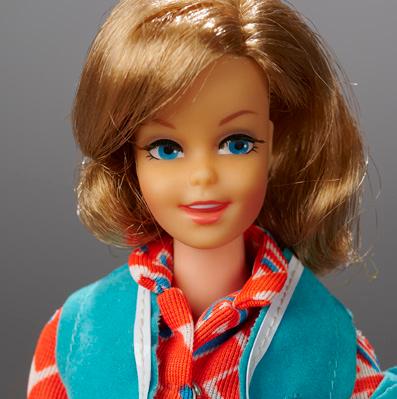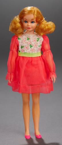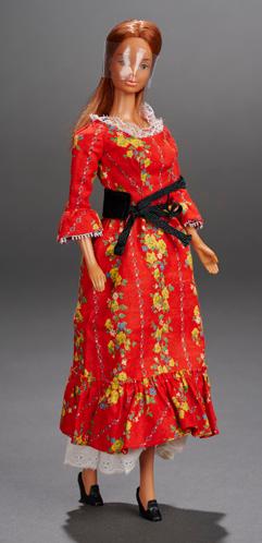 11.5” (29 cm.) Red straight hair that is parted in center, brown eyes, pink lips, twist ‘n turn body with tanned skin tone, bendable legs, wearing “Pleasantly Peasanty” #3360 costume with red print dress, slip, and belt. Excellent condition. Mattel, 1973. $300/400