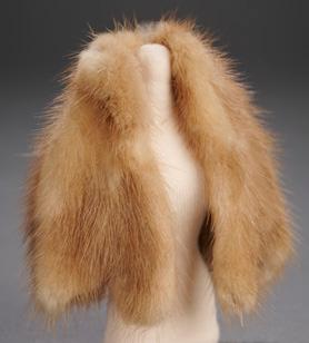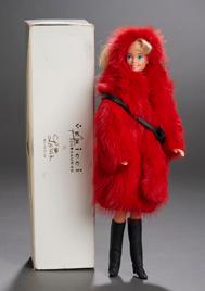 11.5” (29 cm.) 1990’s era Barbie doll wearing dyed red mink coat and hat with leather accessories designed by Lara’s of New York. Excellent condition. Mattel, c.1995. In original box. $100/200